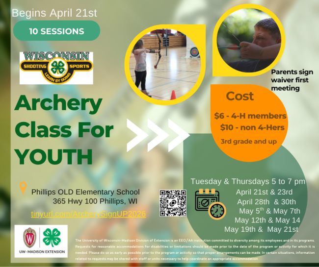 Archery is open to youth age 8-18. OPEN to the Public. Sign Up: tinyurl.com/ArcherySignUP2026