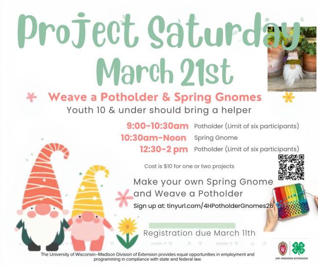 Spring Projects are on their way. Sign up before March 11 at tinyurl.com/4HPotholderGnomes26 Key skills learned are creating a structure, creative design, weaving skills and so much more.